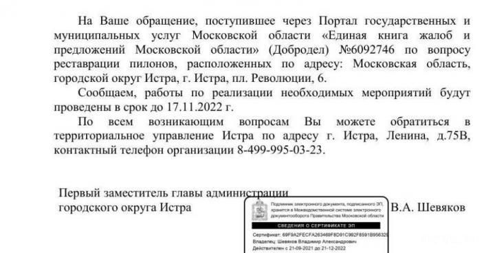 Однако к вопросу также обещают вернуться. По словам уже бывшего первого зама главы Владимира Шевякова, работы по реализации необходимых мероприятий, связанных с реставрацией пилонов, будут проведены в срок до 17 ноября 2022 года.