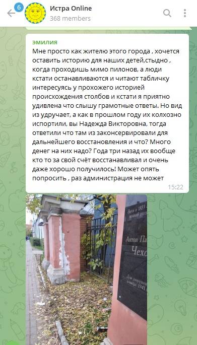 В плачевном состоянии находятся и Чеховские пилоны. О них мы писали не раз. В ноябре 2019 года данный памятник, также связанный с именем великого русского писателя Антона Чехова, чиновники пообещали включить в программу "Комплексное благоустройство дворов и территорий". Осенью 2020 года, после многочисленных обращений горожан, Чеховские пилоны буквально «отдали на растерзание» коммунальщикам, правда, пообещав, что это лишь часть выполненных работ, за которыми последует настоящая реставрация. Летом минувшего, 2021 года, истринцам вновь пообещали, что для последующих ремонтно-реставрационных работ заказаны обмеры, оценка технического состояния кирпича, оценка необходимости гидроизоляции, расчёт вибронагрузки. Тогда в ответе пресс-службы администрации г.о. Истра уточнялось, что получение проекта реставрации пилонов запланировано до конца 2021 года.