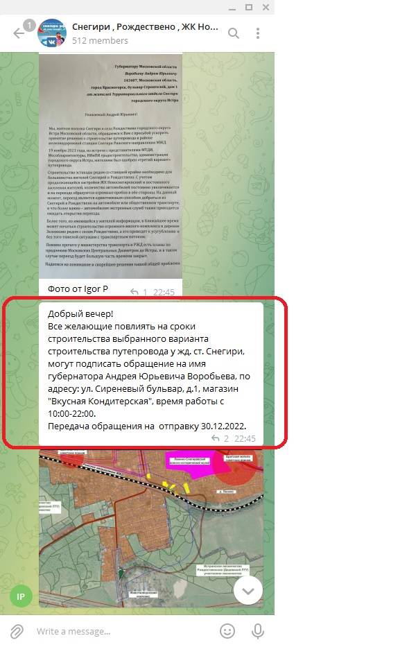 Всё бы ничего, однако, вопреки логике и обещаниям, что с представителями администрации г. о. Истра будет организовано ещё одно собрание 21 января 2022 года (именно к этому моменту представители МТДИ, Мособлархитектуры и НИиПИ должны рассмотреть возможность проектирования альтернативных вариантов проведения путепровода через ж/д пути, идущие вне зоны жилой застройки), в городском чате 21 декабря опубликовано сообщение о сборе подписей «за» строительство 3-го варианта размещения путепровода.