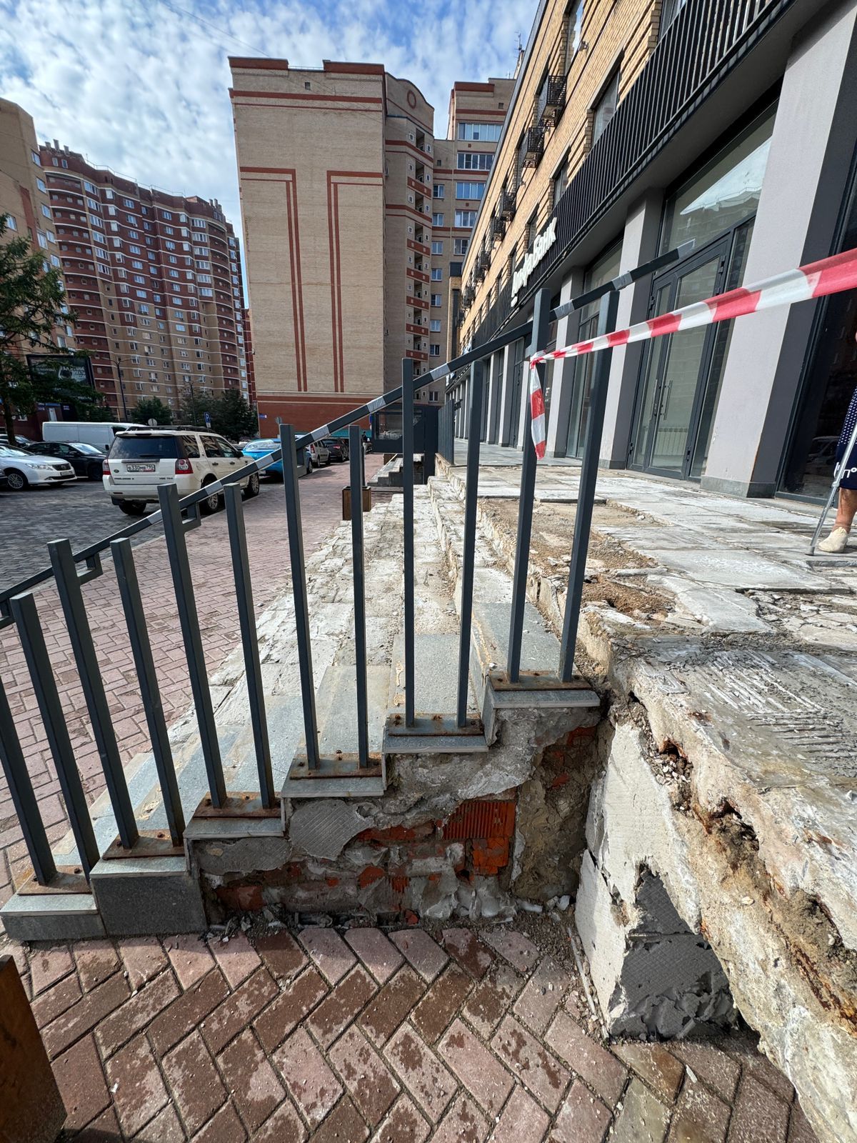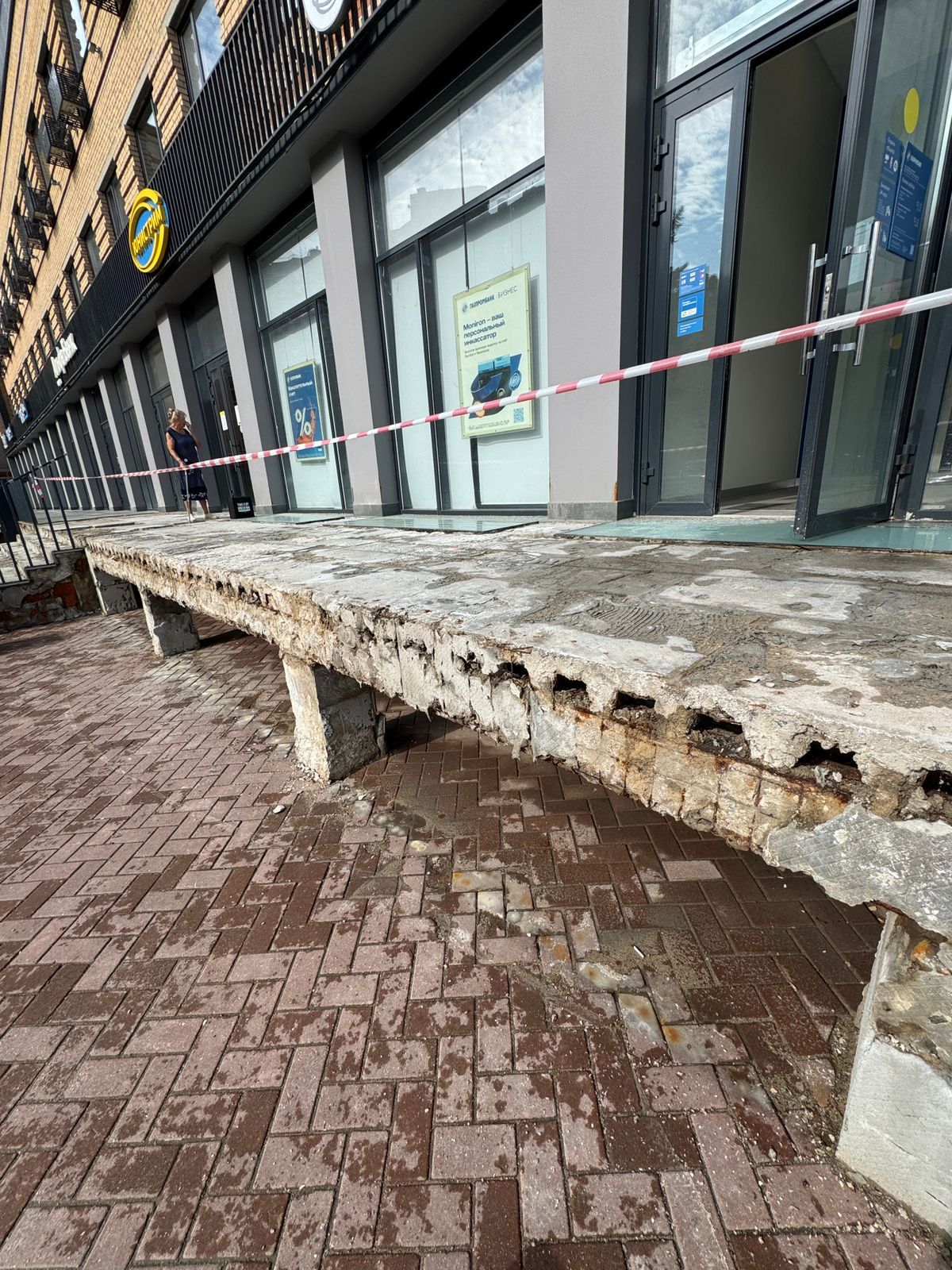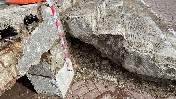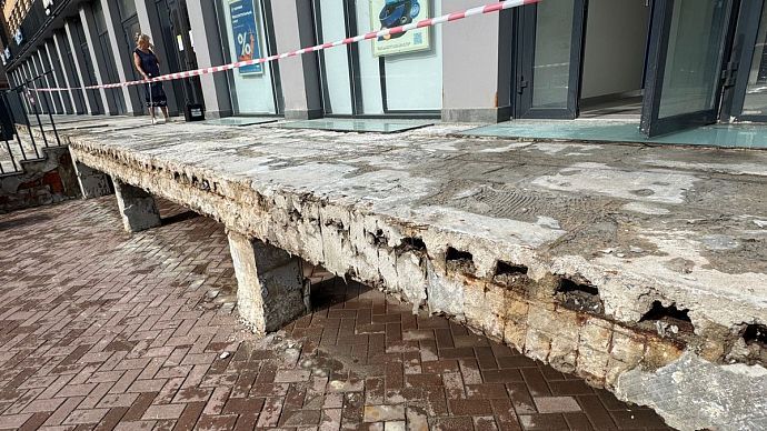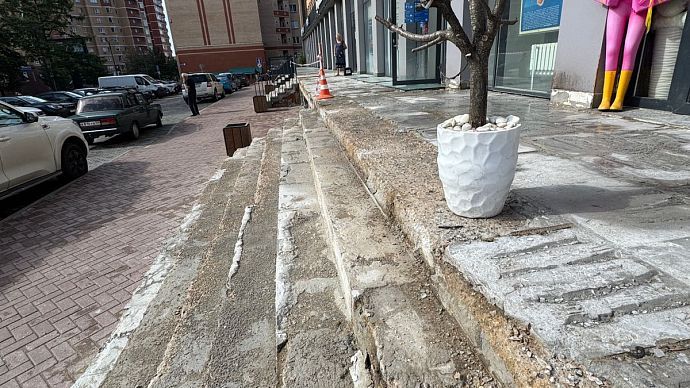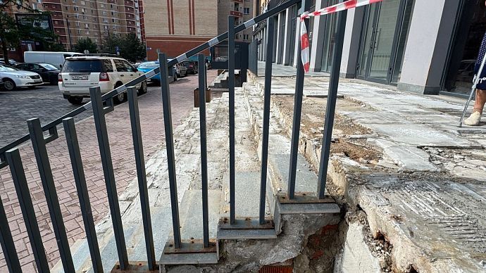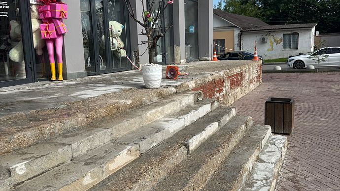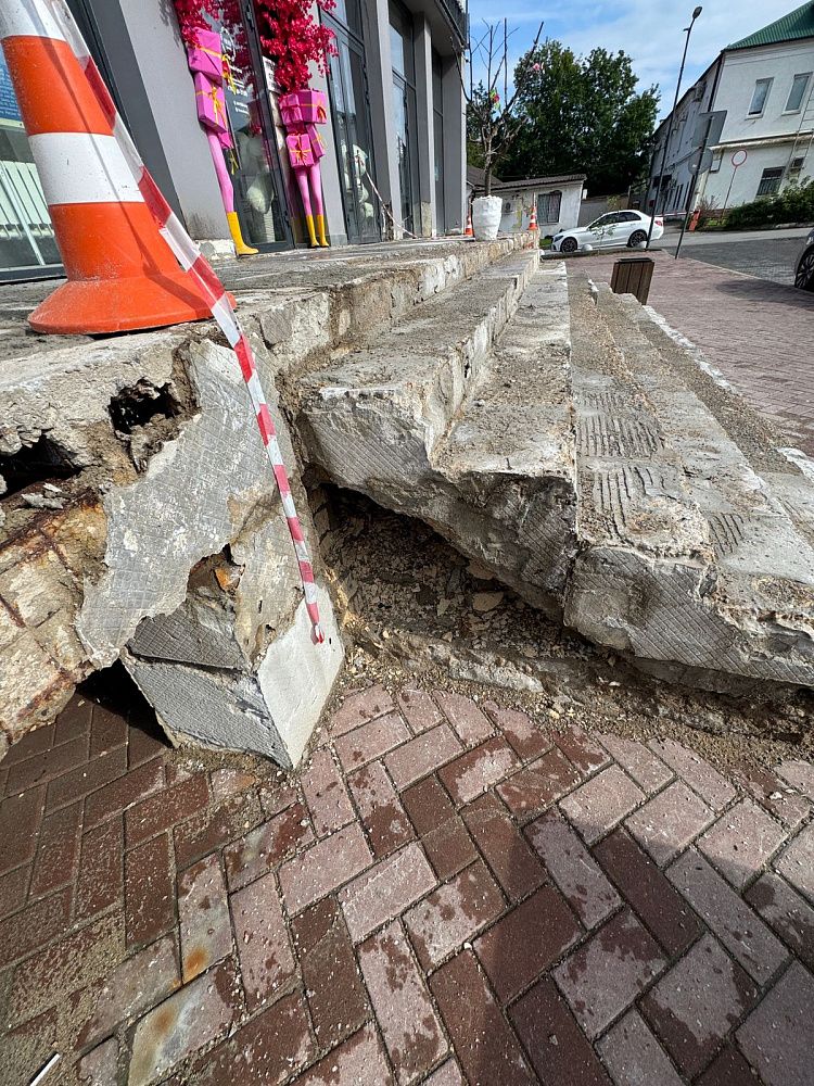 Однако лестничный марш здесь долго не продержался. Современные стройматериалы рассыпались на глазах удивлённых посетителей ещё в феврале. После обращения посетителей, которые едва не получили травмы, спускаясь по аварийным ступеням, с собственником нежилого здания была проведена беседа на предмет определения и согласования сроков проведения ремонтных работ.