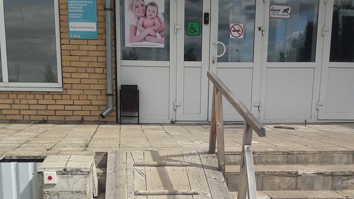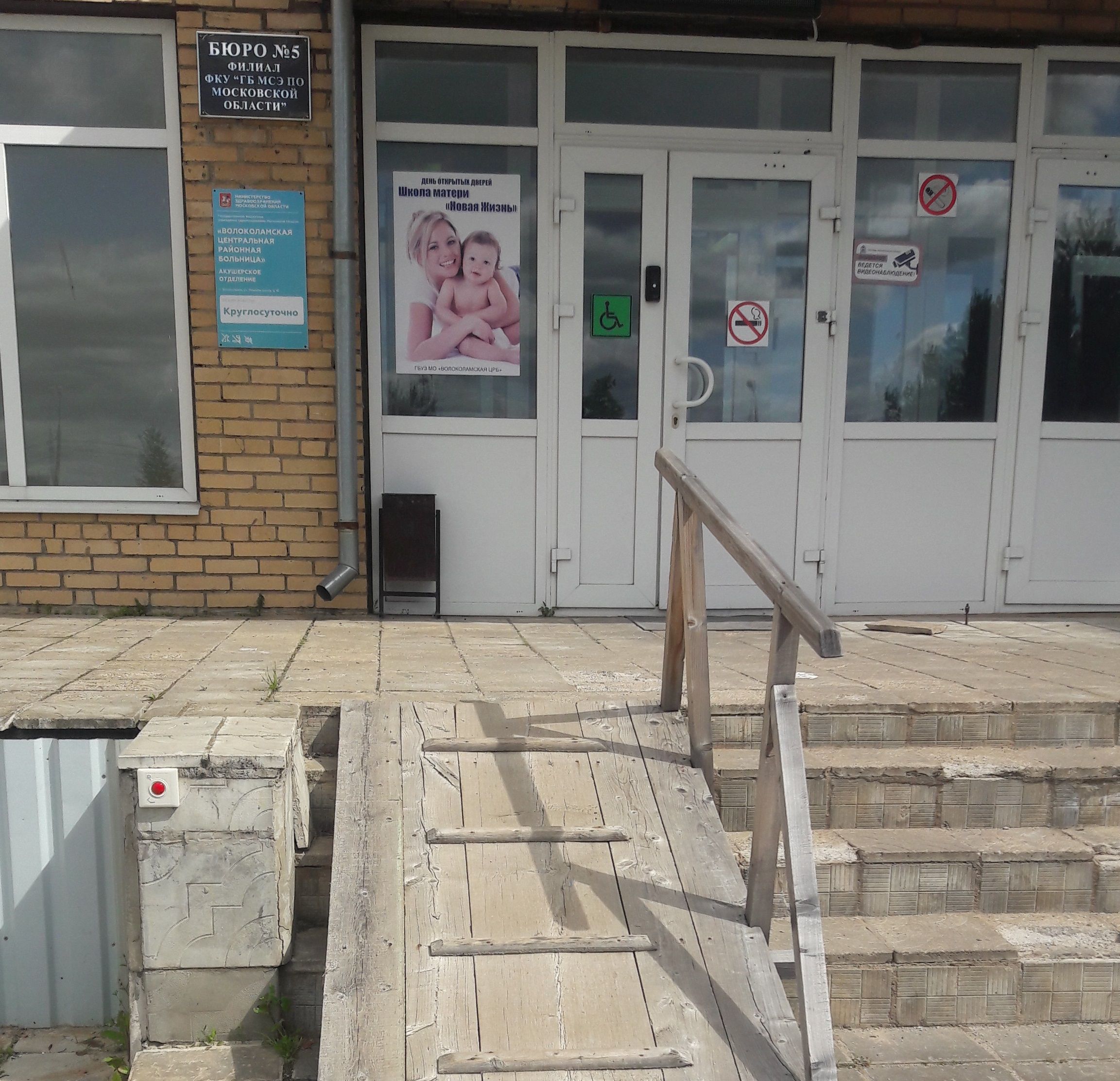 Здесь, на территории Волоколамской больницы, нет даже необходимого многим пандуса. Вместо него инвалиды вынуждены не без посторонней помощи подниматься по обычному деревянному настилу. Не оборудованы здесь и туалетные комнаты, да и достаточного количество сидячих мест для продолжительного ожидания своей очереди вы тоже не обнаружите. Частично, пожалуй, все эти неудобства компенсирует дружелюбный персонал Бюро №5 ФКУ "ГБ МСЭ МО".