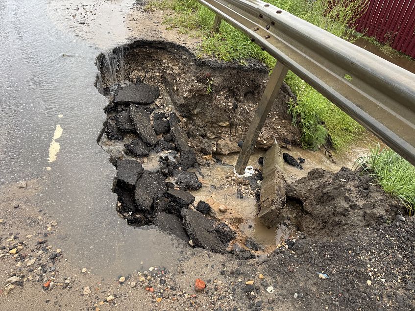 Водопад разрушает дорожное полотно. У обочины начал проваливаться асфальт, яма под ним достигает метровой глубины.