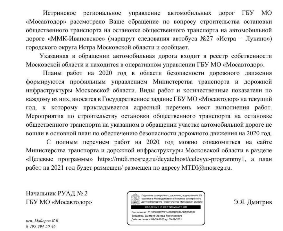 "В 2016 г. я написала жалобу на портал "Добродел" с просьбой оборудовать остановку, мне прислали ответ из Мосавтодора, что в финансирование 2016 г. не заложены деньги на обустройство остановки, но их постараются заложить в бюджет 2017 г. В 2017 г я написала ещё раз. Мне пришел ответ, что в финансировании 2017г не заложено денег на эту остановку, постараются заложить в финансирование 2018г. В 2018г по моим наблюдениям были сделаны многие остановки в Истринском районе, кроме этой", - комментирует ситуацию местная жительница.