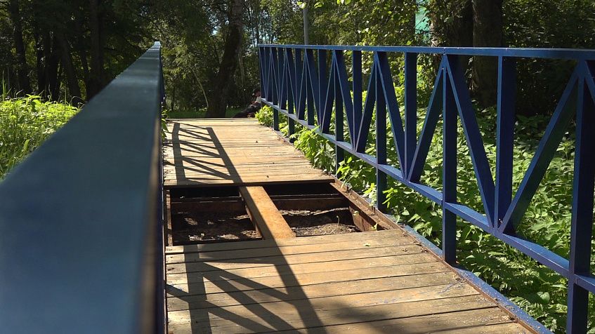 В деревянном настиле моста зияет дыра.
