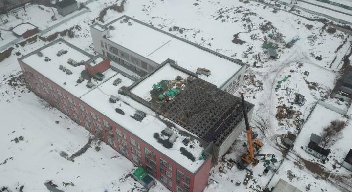 Там уточняется, что на пристройке выполнены работы по возведению монолитного железобетонного каркаса, устройству ограждающих конструкций здания. "Ведутся работы по демонтажу плиты перекрытия. Работников — 10 человек. Техники — 1 единица. Степень готовности — 53%", — уточняется в заметке от 5 апреля 2022 года.