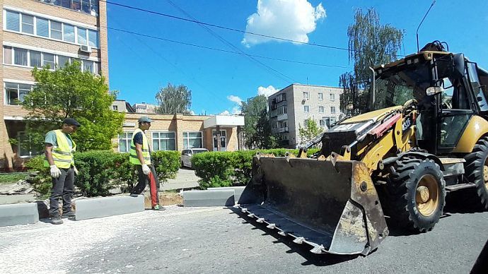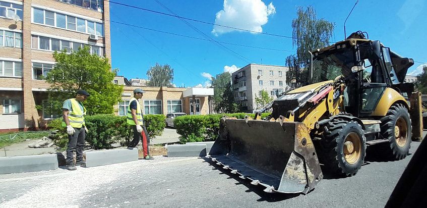 На улице 9-й Гвардейской дивизии дорожные службы приступили к установке нового бордюрного камня.