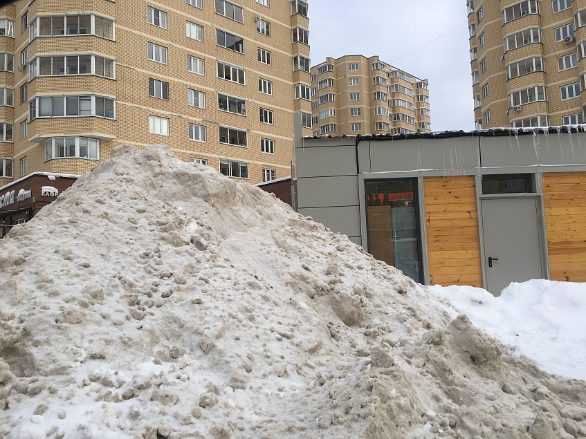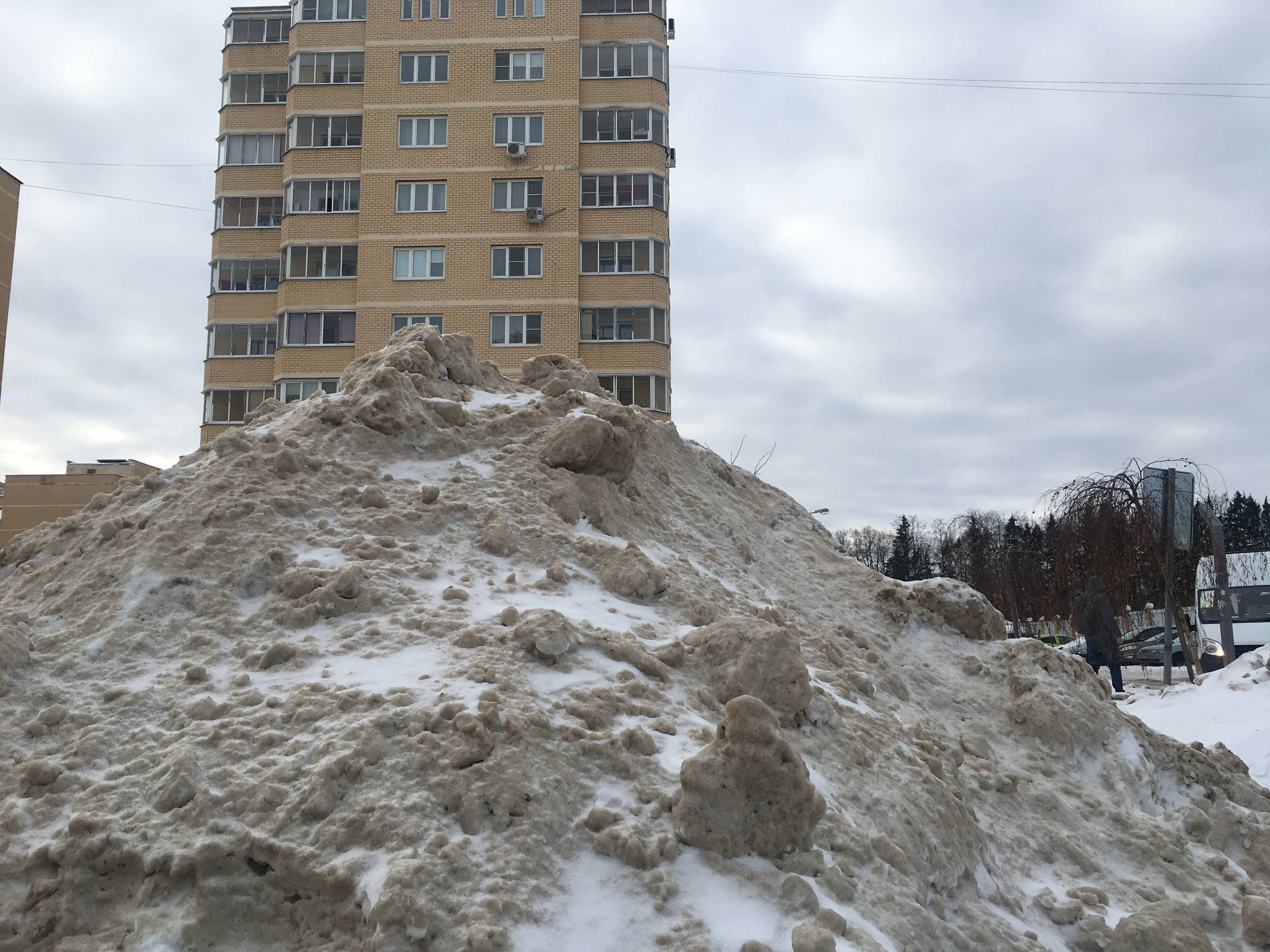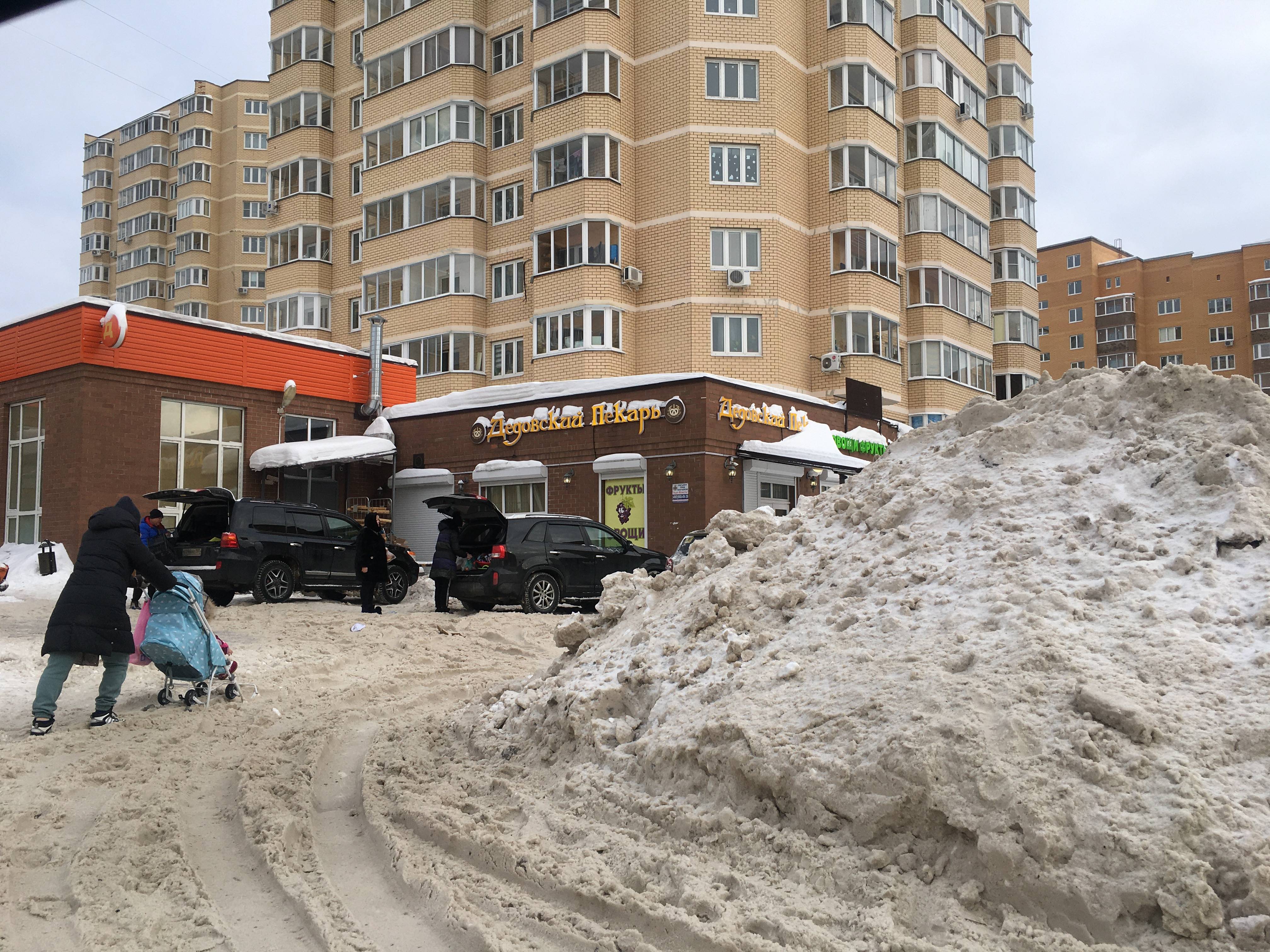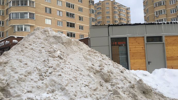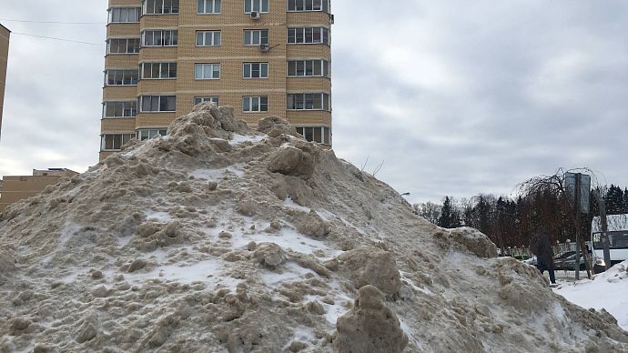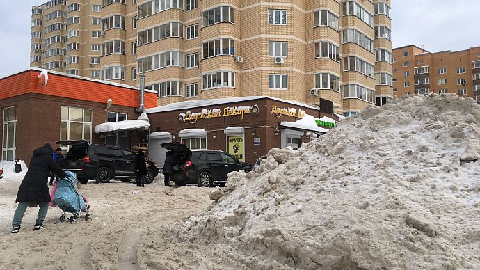 С трудом пробираются по снежной каше и пешеходы. Картину дополняют огромные горы снега, образовавшиеся из-за отсутствия его вывоза и наличия определённых мест для складирования.
