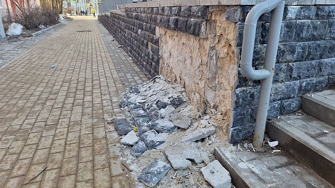 На территории отремонтировали ступени на спусках к поликлинике. Восстановили и выложили декоративной облицовочной плиткой подпорную стену у проезжей части дороги. Однако куски фасада начали отваливаться уже в январе 2025 года.