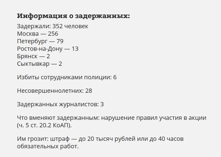 После митинга многие отправились на шествие по переулкам Москвы и к администрации президента, где начались задержания. Всего 10 августа в России было задержано 352 человека, из них в Москве — 256 (информация с сайта ОВД-Инфо).