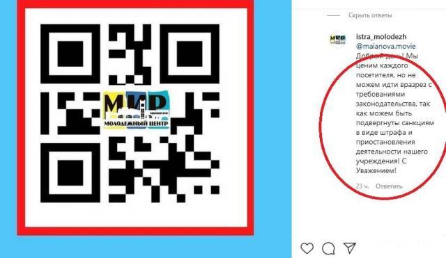 Молодёжный Центр «Мир», ссылаясь на постановление губернатора Московской области от 23.06.2021 г., опубликовал следующую информацию: "С 28 июня 2021 года зрители, получатели других услуг и посетители допускаются на массовые мероприятия при предъявлении: специального QR-кода (сертификата профилактической прививки от COVID – 19) и документа, удостоверяющего личность".