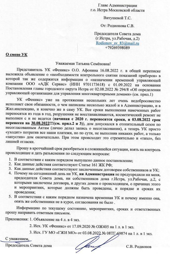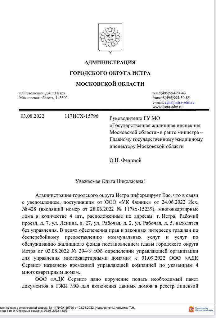 А уже 3 августа администрация округа направила письмо в Госжилинспекцию, которое подтверждает факт «тихого» ухода «Феникса» и назначения нам новой УК «АДК Сервис».