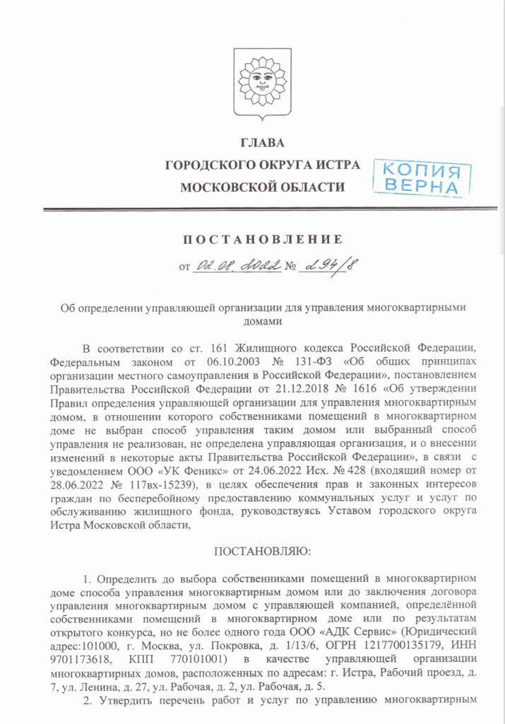 - Совершенно случайно. Нашли постановление главы городского округа Истра от 02.08.2022 № 294/8 «Об определении управляющей организации для управления многоквартирными домами». С 01.09.2022 ООО «АДК Сервис» назначено временной управляющей компанией по указанным 4 многоквартирным домам.