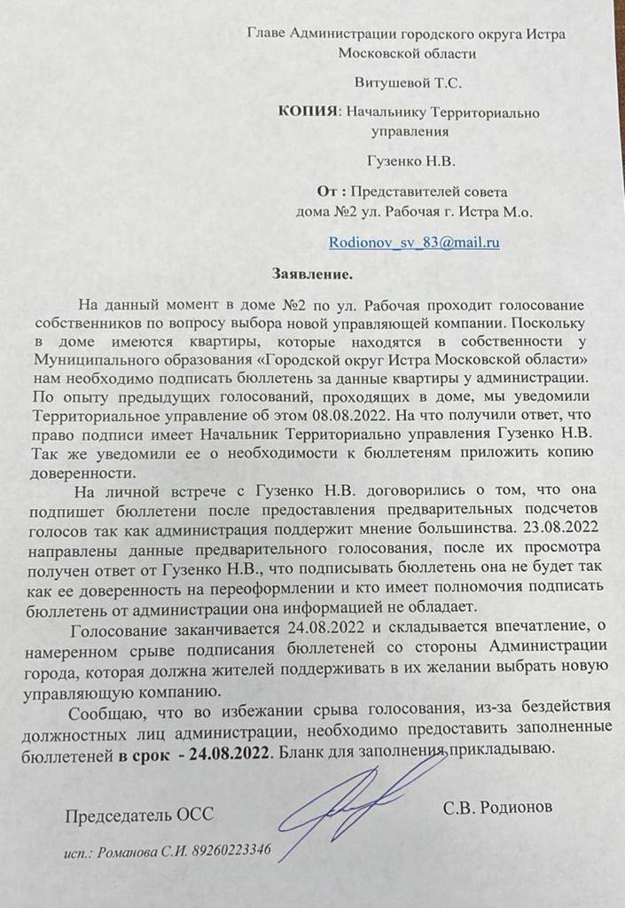 - Да, 16.08.2022 главе администрации г. о. Истра Московской области Витушевой Т. С. нами было написано письмо с просьбой дать разъяснения о происходящем. Ответа до сих пор (21.09.2022 г.) нет.