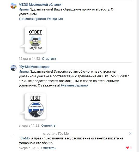 Несмотря на все те неудобства, на которые указали горожане, "Мосавтодор" в своих ответах непреклонен: "Устройство автобусного павильона на указанном участке в соответствии с требованиями ГОСТ 52766-2007 п.5.3. не представляется возможным, в связи со стеснёнными условиями".