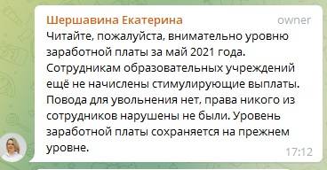 После непродолжительной полемики в группе "Истра.Образование" появился комментарий начальника Управления образованием г. о. Истра Екатерины Шершавиной. По словам чиновницы, заработная плата сотрудников остаётся на прежнем уровне, а именно соответствует либо выше средней заработной платы работников образовательных организаций по Московской области. В своём ответе начальник управления всё же ссылается на новую систему оплаты труда, которая была введена с 01.09.2021 года в г.о. Истра для педагогических и иных сотрудников муниципальных образовательных учреждений.