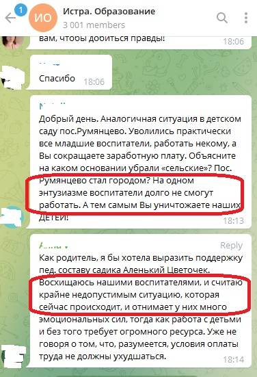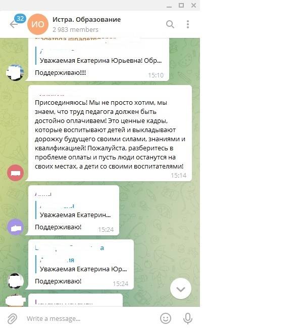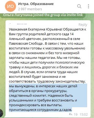 В телеграмм-канале родители массово обращаются к начальнику управления образованием администрации городского округа Истра с просьбой разобраться в ситуации, когда педагоги и воспитатели готовы уволиться по причине изменения системы оплаты труда.