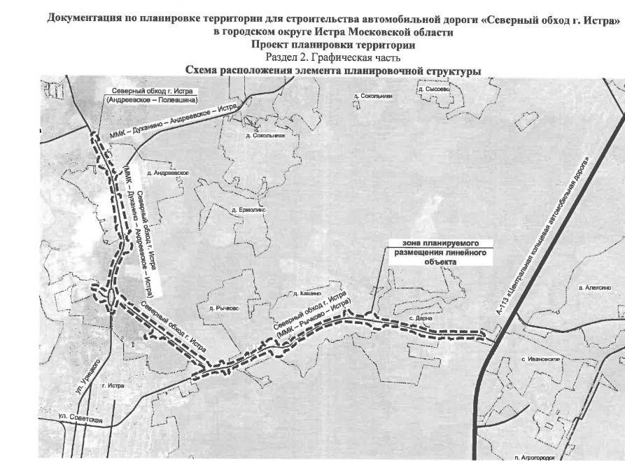 Проект планировки территории предусматривает строительство автодороги «Северный обход г.Истра» с реконструкцией участков автомобильных «Андреевское-Полевшина», «ММК-Духанино-Андреевское-Истра», «ММК-Рычково-Истра» по параметрам III категории с двумя полосами движения.