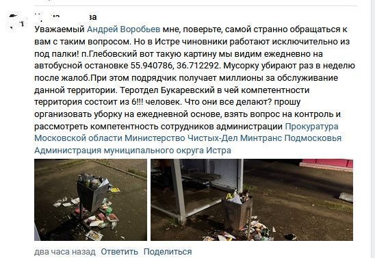 После того, как очередное обращение попало на повестку губернатору региона Андрею Воробьёву, урна была опустошена дворниками в течение получаса. Однако это не исключает того, что буквально завтра ситуация не повторится.