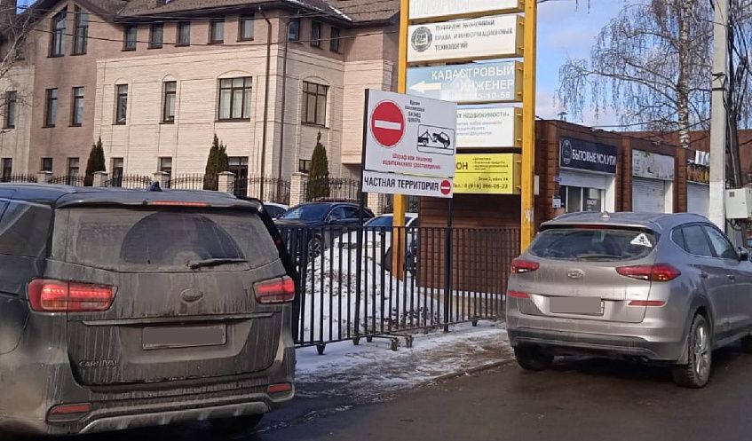 Надпись на самовольно установленной конструкции строго гласит о том, что всех, кроме посетителей бизнес-центра на Рябкина, 1 в Истре, ожидает штраф или лишение водительского удостоверения. Правомерность подобных угроз попытались выяснить сами горожане.