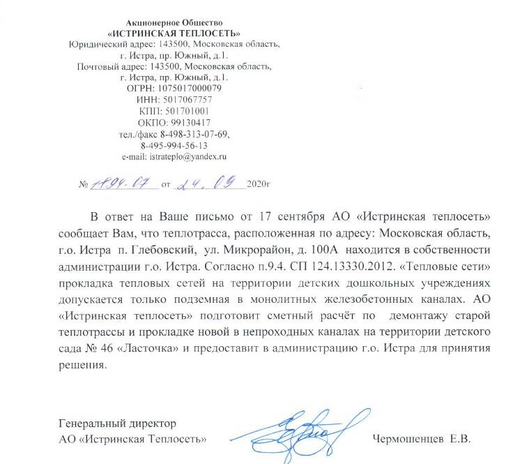 А так как данная теплосеть находится в собственности администрации г.о.Истра, то и решение конечное придётся принимать чиновникам. Надолго ли затянется данный процесс пока не понятно, в свою очередь Истринская теплосеть спешит отчитаться: "Организация подготовит сметный расчет по демонтажу старой теплотрассы и прокладке новой в непроходных каналах и предоставит его в администрацию".