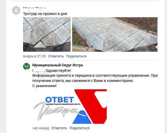 Тротуар, о ремонте которого отчитались чиновники Истры, развалился за сутки