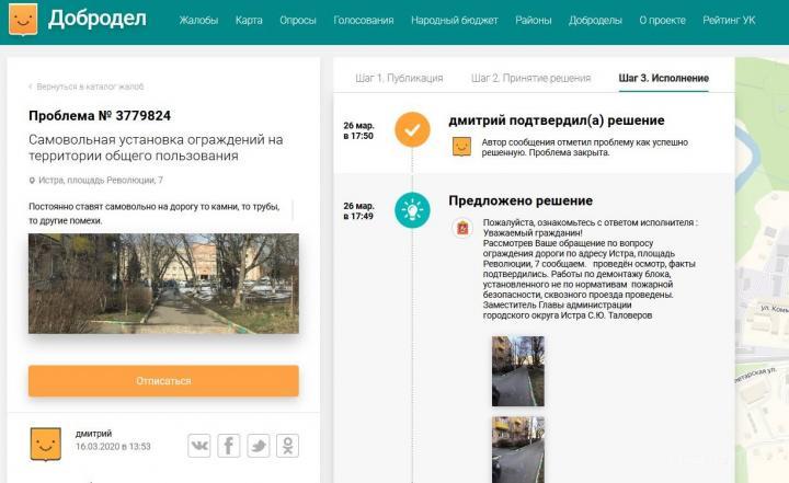 Всё бы ничего, но буквально в начале марта другой заявитель просил этот же самый блок вернуть на место: "Прошу уважаемую администрацию вернуться к вопросу установки знаков и лежачих полицейских по адресу: Истра, площадь Революции, 7 и установить обратно ограничители проезда, т.к. возле многоквартирного дома по вашему велению ринулся поток машин, а у нас живут и дети и пожилые граждане, которым даже отпрыгивать с дороги некуда!!! Дорога проходит в непосредственной близости к подъездам".