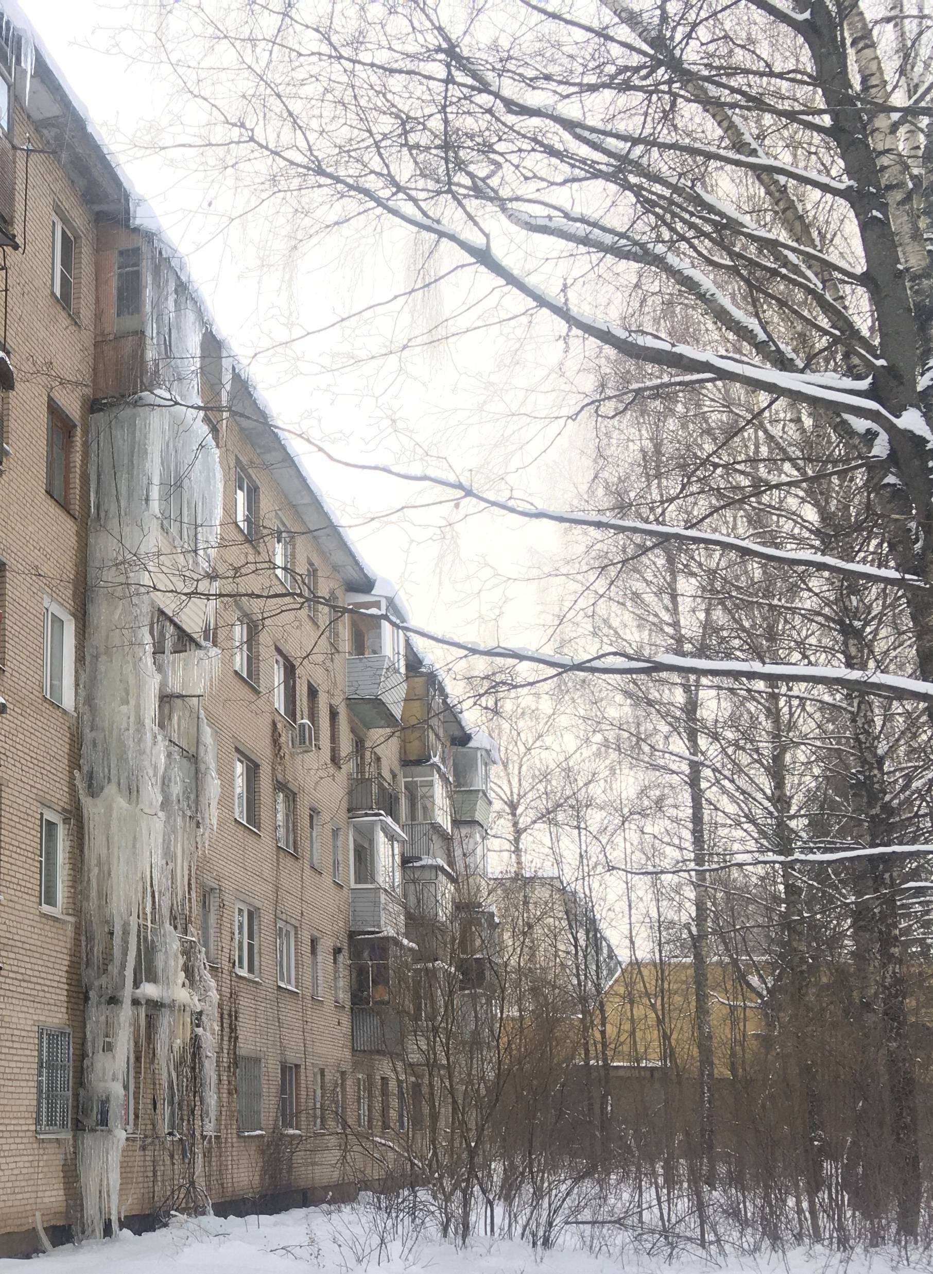 Он свисает с пятого этажа до самой земли. Застывший водопад может смело претендовать на звание самой большой сосульки в округе и стать местной достопримечательностью.