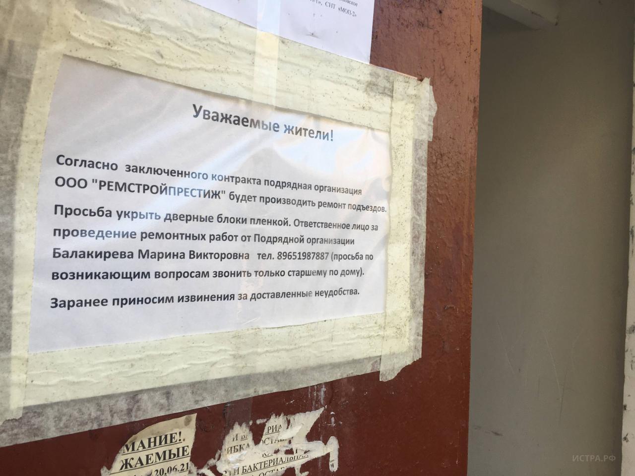 Сейчас в подъездах сняты кодовые замки и доводчики на входных дверях, а двери во многие квартиры хозяева завесили плёнкой по просьбе подрядчиков. Однако их здесь не видели уже давно, а потому такие меры предосторожности доставляют лишь неудобство.