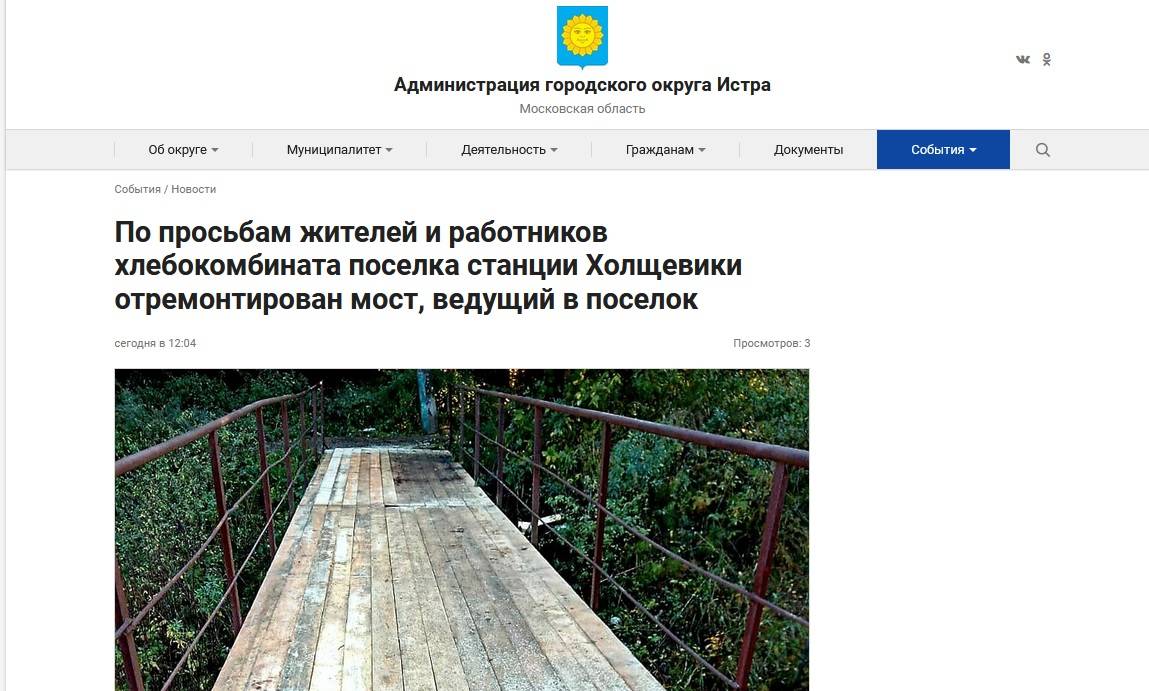 "Работы по обновлению моста досками были завершены вчера, и сегодня жители и рабочие предприятия проходят по обновлённой пешеходной переправе без опаски", — говорится в очередной заметке пресс-службы г. о. Истра.