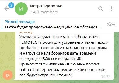 В половине одиннадцатого сегодняшнего утра в чате появилась информация: "ГЕМОТЕСТ просит для устранения технических проблем, возникших из-за большого наплыва и нагрузки на лаборантов, дать время сегодня до 13:00 всё исправить", — представитель сферы здравоохранения и просит набраться терпения и обещает, что все технические неполадки будут устранены.
