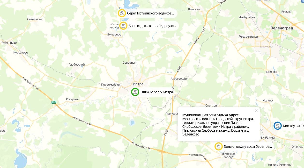 На карте указан и частный пляж городской округ Истра: д. Лечищево, ул. Песчаная, д. 2 (пляж "Яхонты Истра").