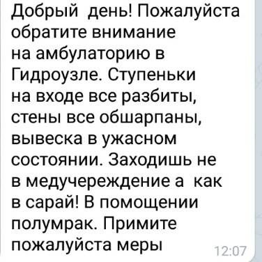 Жители Посёлка Гидроузла им. Куйбышева разместили на данном ресурсе просьбу обратить внимание на амбулаторию в их населённом пункте.