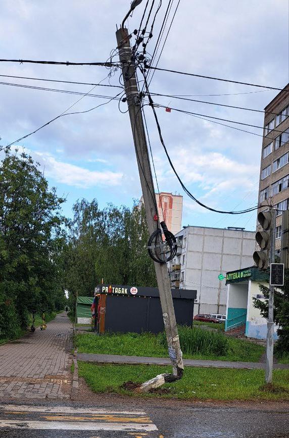 Жители выдвигают несколько версий: столб подмыли потоки воды после очередного ливня, он стал участником ДТП или падает от старости.