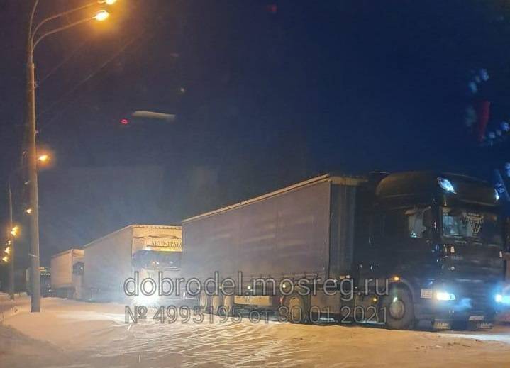 Автомобилисты попросили принять меры по запрету стоянки большегрузных машин вблизи ЖК «Павловский квартал» (г.о. Истра, д. Лобаново), напротив КП «Павловы озера»: