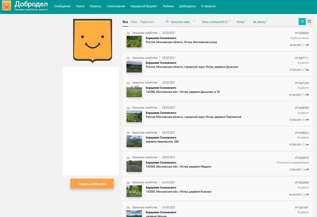Несмотря на работу, обращения по данному вопросу продолжают поступать от граждан через портал «Добродел». Опасный сорняк замечен не только в полях и на подступах к жилым посёлкам и городам, но и на детских площадках и вблизи пешеходных троп. В последнем из сообщений истринцы попросили оперативно отреагировать на борщевик, который вскоре может стать серьёзным препятствием на пешем пути вдоль Волоколамского шоссе к новым микрорайонам.
