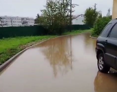 Огромный водоём у дома организовали местным жителям благоустроители. В настоящее время здесь полным ходом ведутся работы по ремонту дворовой территории. Цена вопроса — несколько десятков миллионов рублей. При этом, со слов местных, специалисты игнорируют все просьбы местных на оборудование ливневой канализации. Таким образом, воде просто некуда деваться и она стойко держится в новых бордюрах.