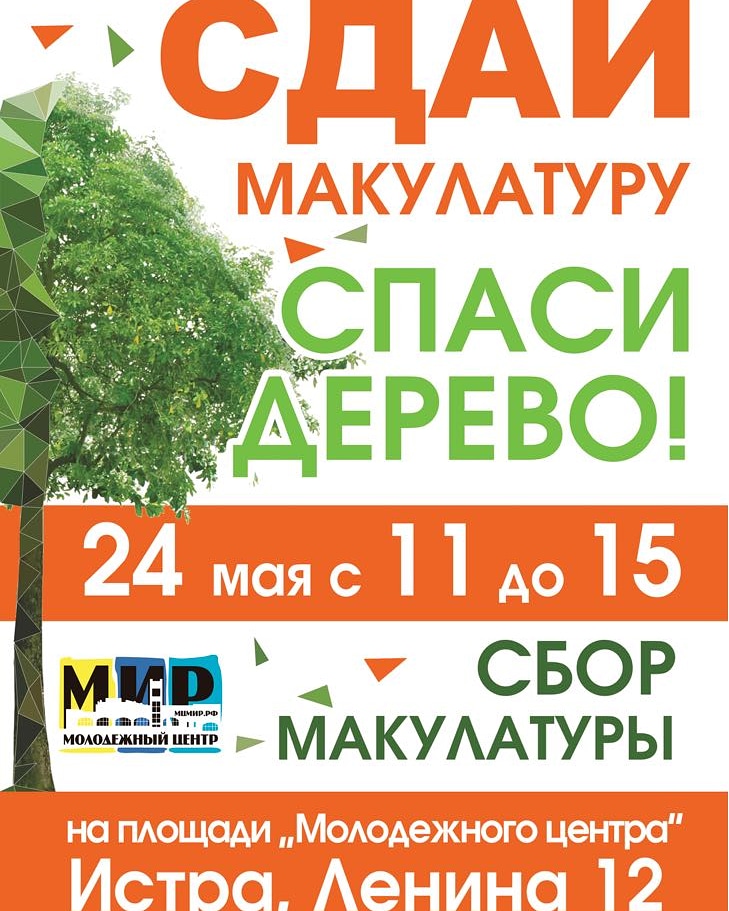 Сбор макулатуры в городском округе Истра состоится у Молодёжного центра "Мир" - ул Ленина, 12. Машина для сбора макулатуры будет стоять на площади Дружбы 24 мая с 11.00 до 15.00.
