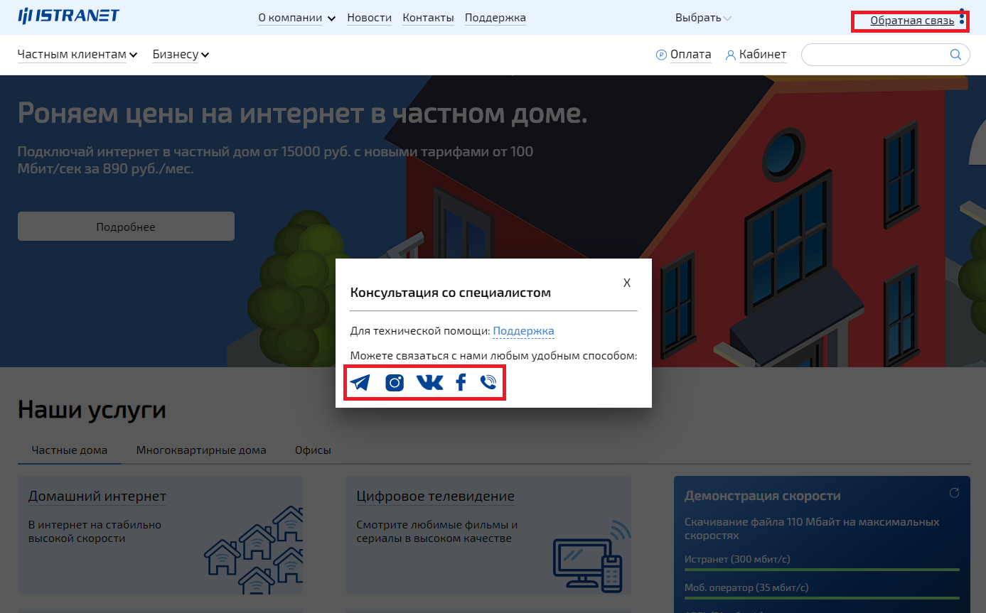 - Связаться со специалистами компании через социальные сети. Для этого в правом верхнем углу на сайте компании «Истранет» нажмите на кнопку «Обратная связь». Во всплывающем окне выберите наиболее удобный мессенджер или социальную сеть для общения: