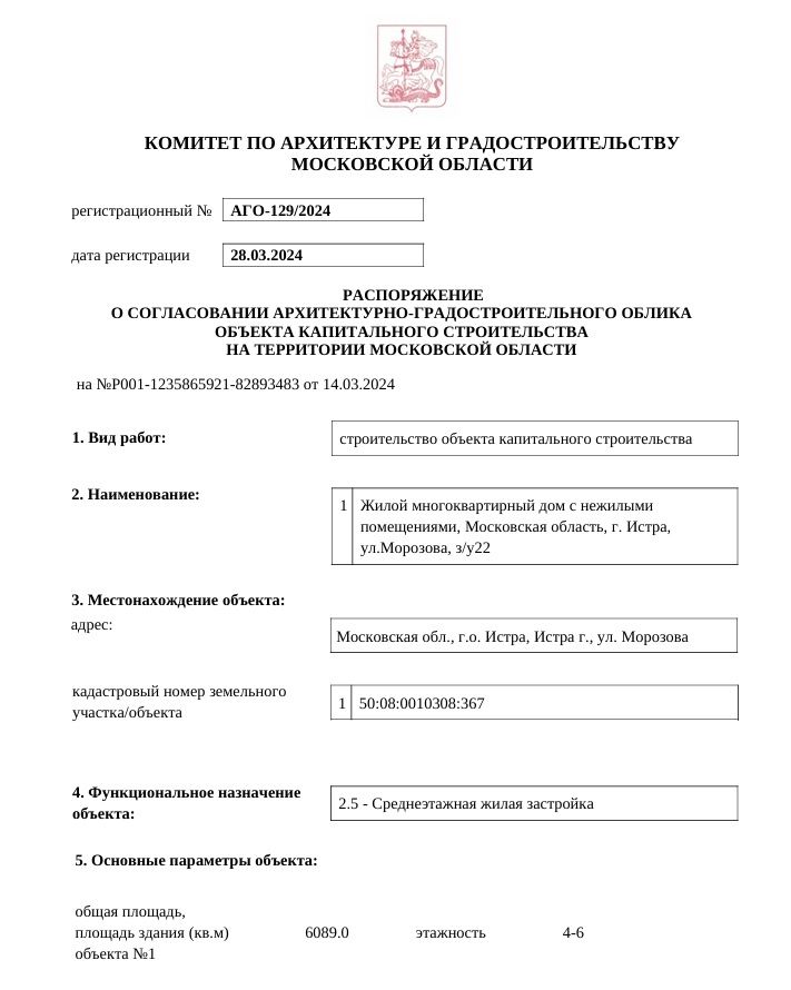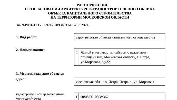 Разрешение на строительство объекта капитального строительства, а именно — жилого многоквартирного дома с нежилыми помещениями, было получено от Комитета по архитектуре в марте 2024 года.