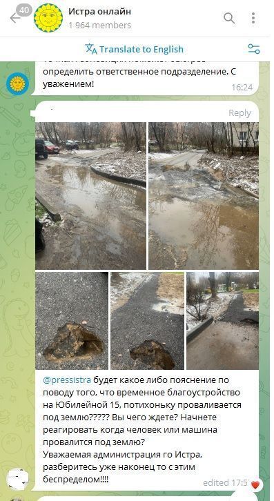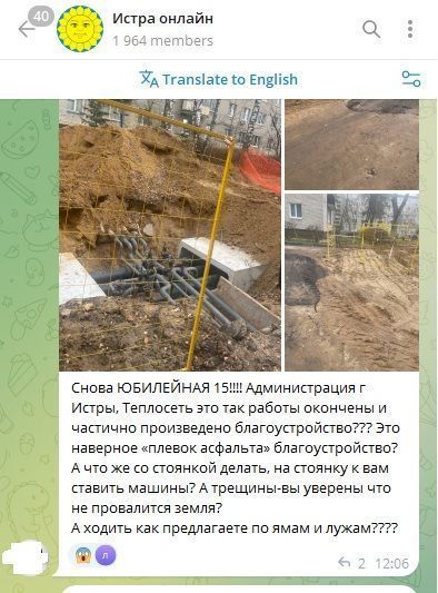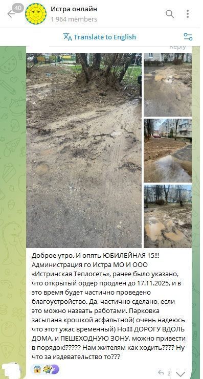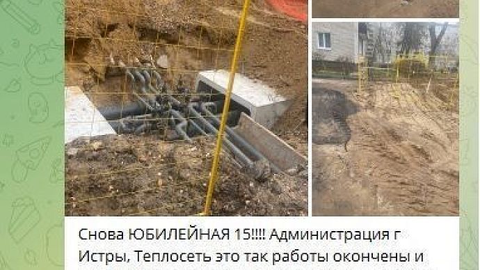 Речь идёт о дворовой территории вблизи дома 15 по улице Юбилейной. Ранее здесь был проведён ремонт коммуникаций. Позже «Истринская теплосеть» продлила ордер на осуществление работ, в рамках которого до 17 ноября представители организации должны были частично провести благоустройство.