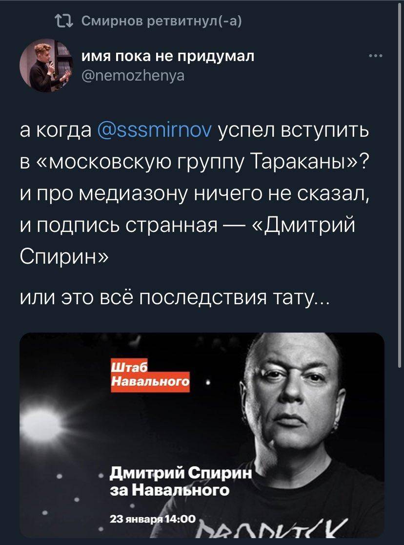 Самое занятное в этой истории, что поводом для ареста стал ретвит самого Смирнова, где его из-за похожести сравнивают с лидером группы “Тараканы” Дмитрием Спириным. На фото изображён Спирин с подписью: