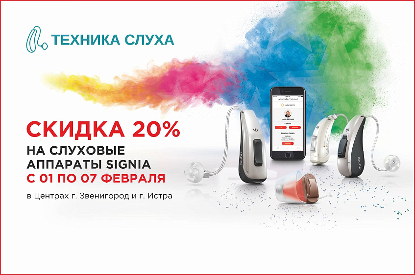 - воспользоваться скидкой 20% при покупке слуховых аппаратов Signia.