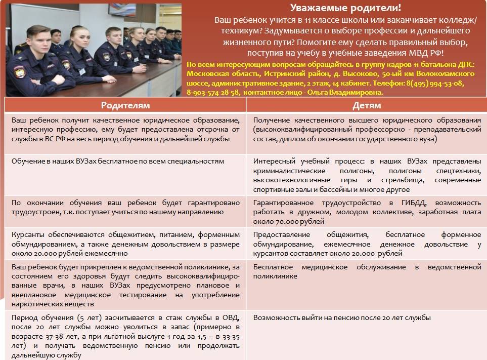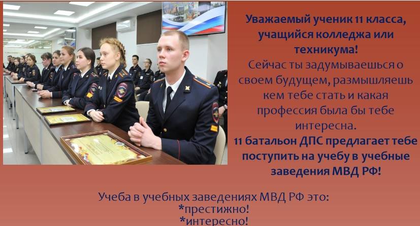 11 батальон ДПС 1 полка ДПС (северный) ГИБДД ГУ МВД России по Московской области объявляет набор учащихся 11 классов общеобразовательных школ, а также окончивших средние образовательные учреждения для поступления в государственные образовательные учреждения МВД Российской Федерации в Московский университет МВД России им. В.Я. Кикотя и Московский областной филиал Московского университета МВД России с последующим гарантированным трудоустройством.