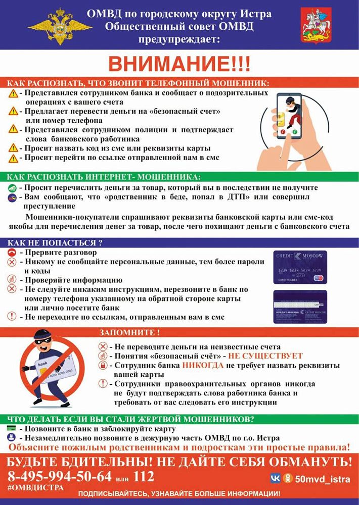 ОМВД России по городскому округу Истра предупреждает об участившихся случаях хищения денежных средств со счетов банковских карт