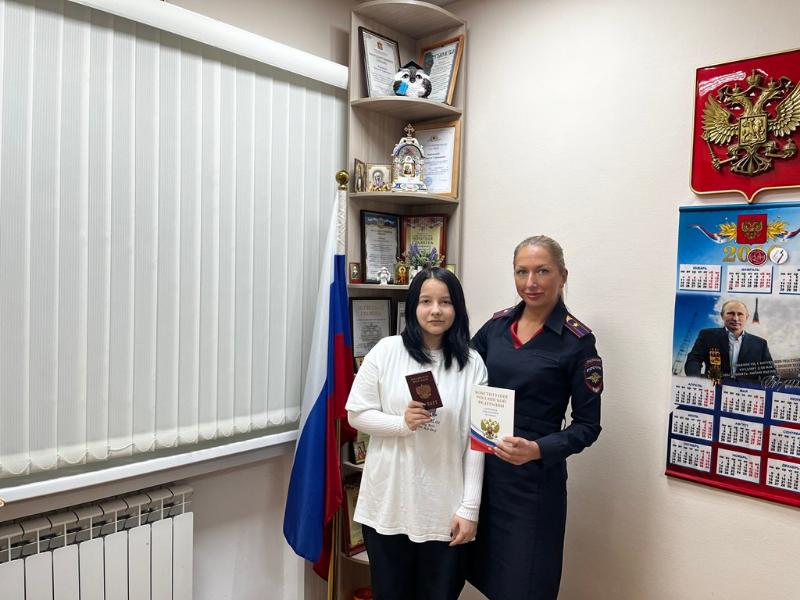 Сотрудница полиции поздравила молодых людей со значимым событием и вручила экземпляры Конституции Российской Федерации.