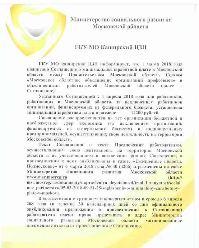 1 марта 2018 года подписано Соглашение о минимальной заработной плате в Московской области между региональным правительством, Союзом «Московское областное объединение организаций профсоюзов» и объединениями работодателей Московской области.