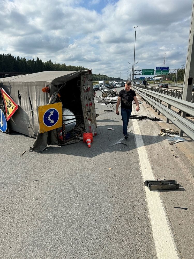 Самые значительные повреждения получила стоящая в полосе «Газель» дорожной службы с прикреплёнными дорожными знаками и окружённая необходимыми для проведения работ дорожными конусами, она опрокинулась набок.