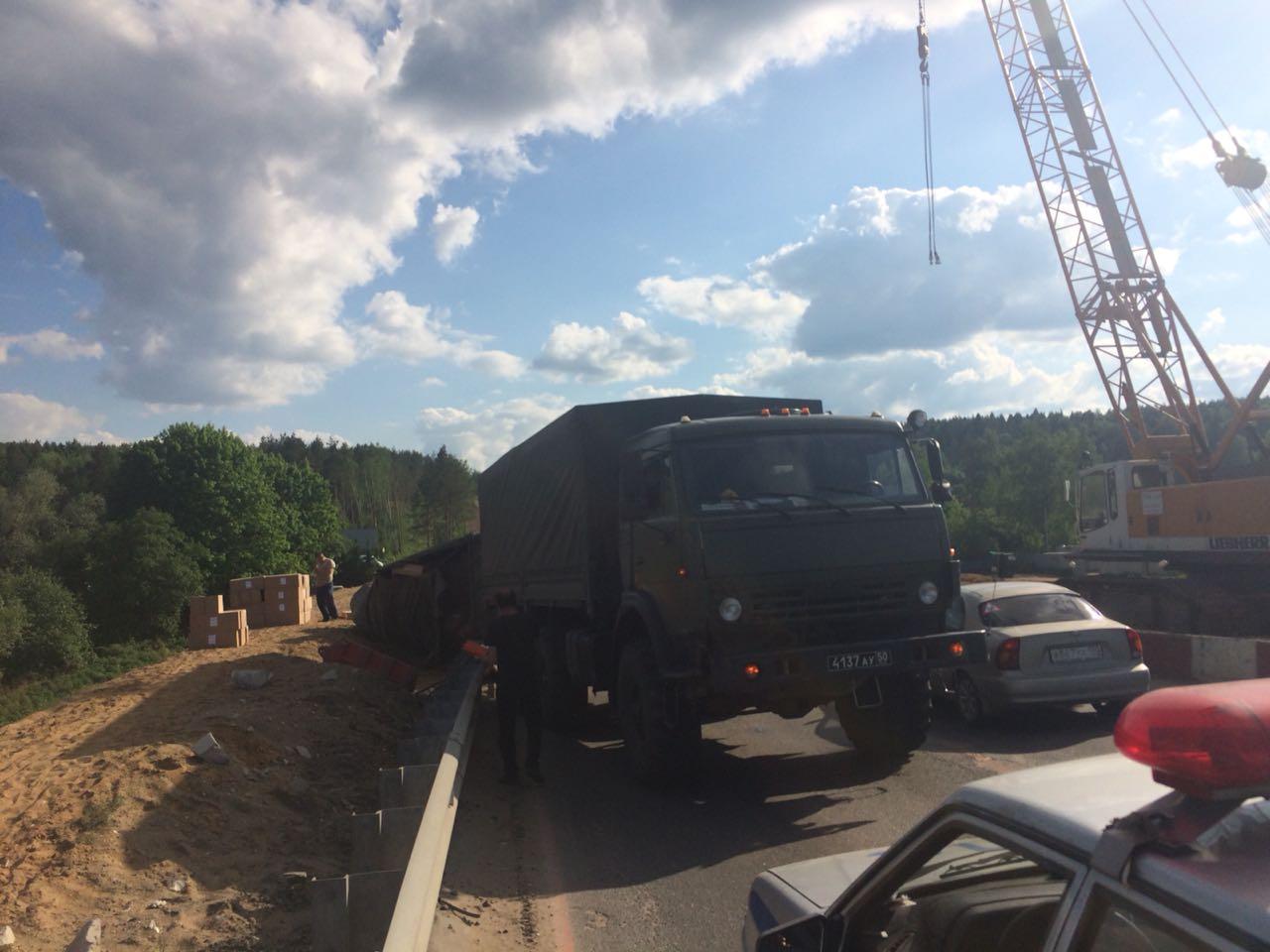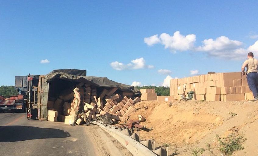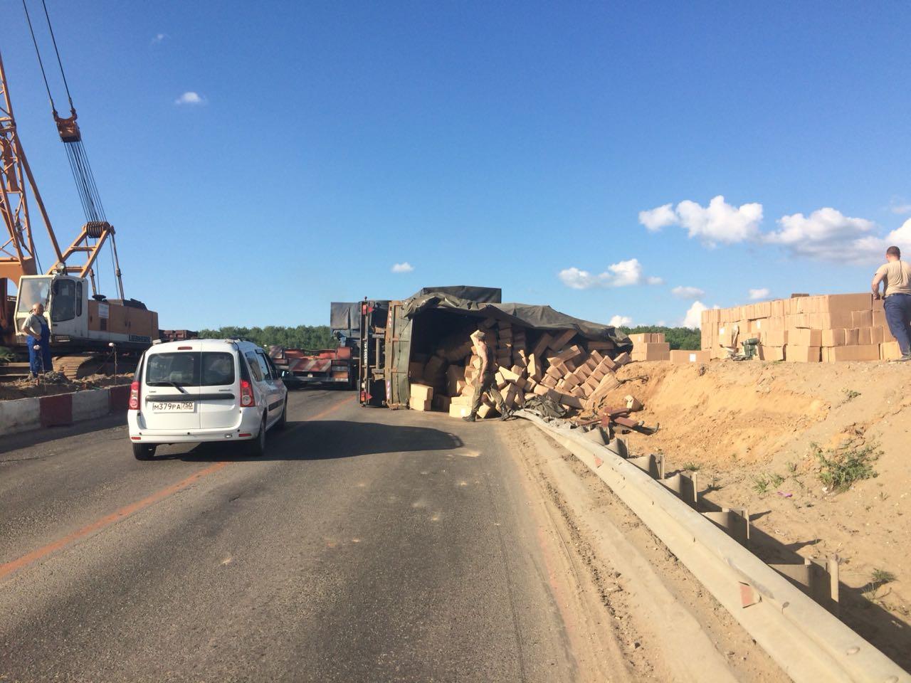 В сообщении 11 СБ ДПС говорится, что ДТП произошло 23 мая около половины шестого вечера на 30 км а/д А-107 "ММК Можайско-Волоколамского направления". По предварительной версии, водитель КамАЗа превысил скорость на опасном участке дороги, вследствие чего наехал на препятствие и прицеп опрокинулся. Из-за опрокидывания произошло падение груза.