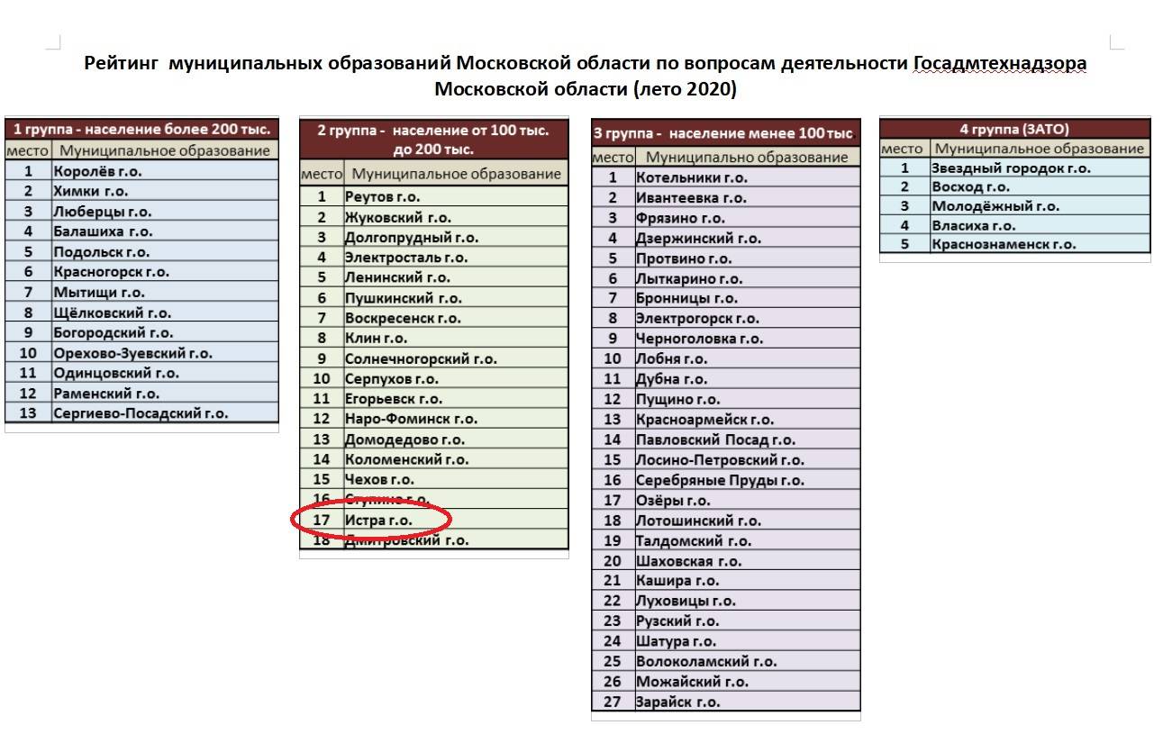 Согласно документу, Истра занимает 17 строчку в своей группе, уступив последнее место лишь Дмитровскому городскому округу.