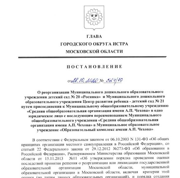 В Постановлении от 28 октября главой округа подписана очередная реорганизация. На этот раз речь идёт о присоединении двух детских садов, №20 «Росинка» и МДОУ №21, к общеобразовательной школе им. Чехова.